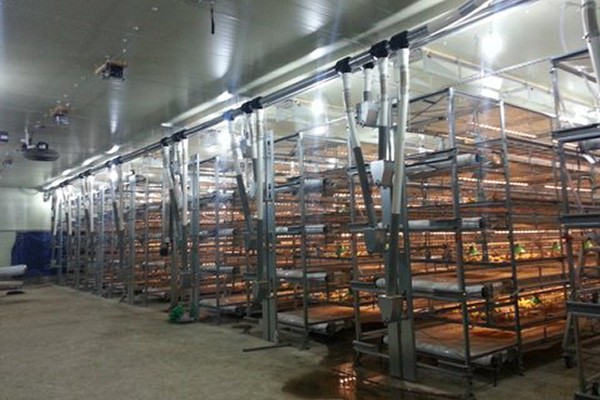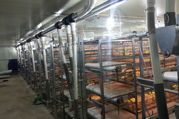 The soft floor automatically shapes itself to the birds' bodies. The animals are automatically transported by lift out of the system and delivered for loading. The faeces are removed from the system by a special manure conveyor belt, manufactured in PP. These conveyor units are located beneath each level of animals within the system.